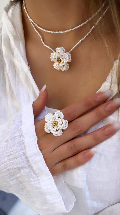 ست انگشتر و گردنبند گلدار، ظریف و زنانه با طراحی الهامگرفته از طبیعت؛ جلوهای شاعرانه و لطیف برای استایلی خاص و عاشقانه.